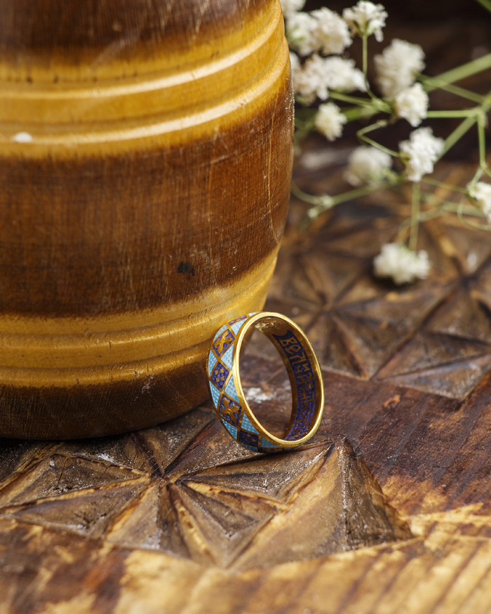 Чередование больших и малых крестов создают непрерывный узор по внешней стороне кольца. Концы крестов украшены лилиями – символом чистоты и надежды. Внутри кольца проложенная эмалью надпись: «Величаем тебя, святитель Николай, и чтим святую память твою» – краткая песнь, прославляющая дела святителя и чудотворца Николая, архиепископа Мир Ликийских.