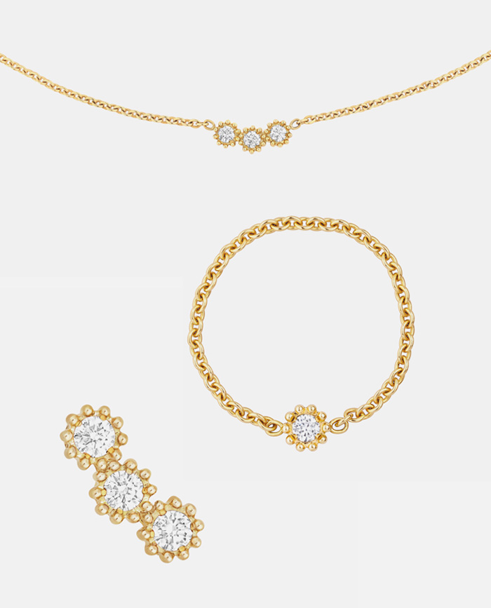 Dior представил новую ювелирную коллекцию Mimirose, приуроченную к 20-летию направления Dior Joaillerie. Для нее арт-директор Виктуар де Кастеллан создала миниатюрные серьги, кольца, браслеты и подвески из желтого и розового золота с прозрачными бриллиантами, ярко-красными рубинами и зелеными изумрудами. Их можно носить как по отдельности, так и сочетать друг с другом.
